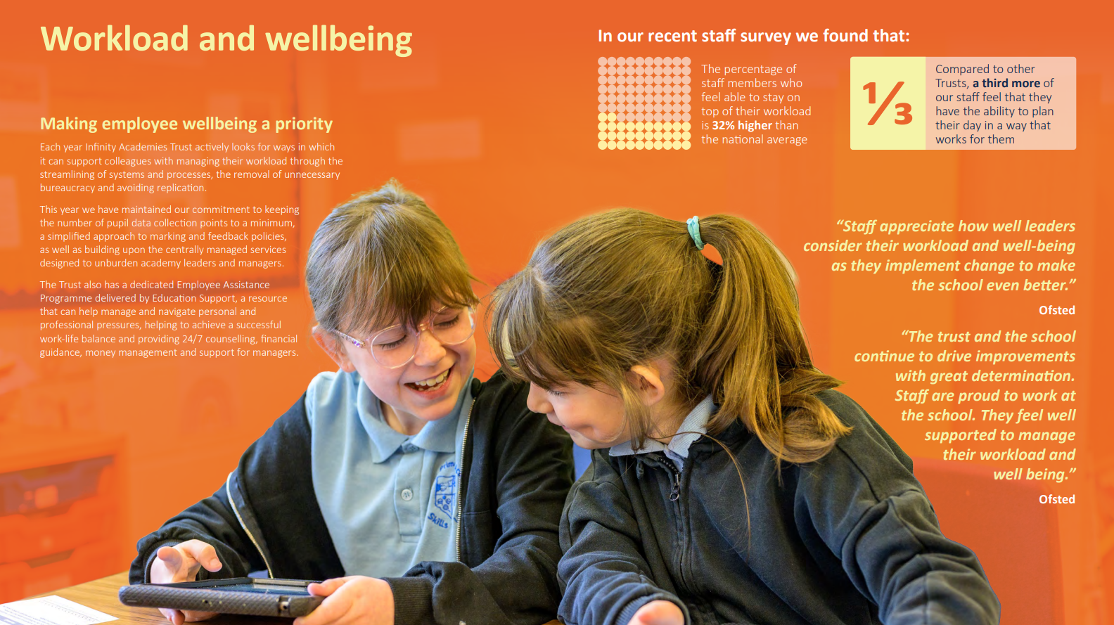 Each year Infinity Academies Trust actively looks for ways in which it can support colleagues with managing their workload through the streamlining of systems and processes, the removal of unnecessary bureaucracy and avoiding replication.